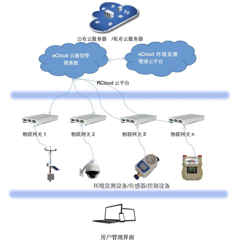 The solution system architecture mainly includes cloud server, device IOT gateway, ecloud environment monitoring and management cloud platform, ecloud cloud communication system, environment monitoring equipment and control equipment