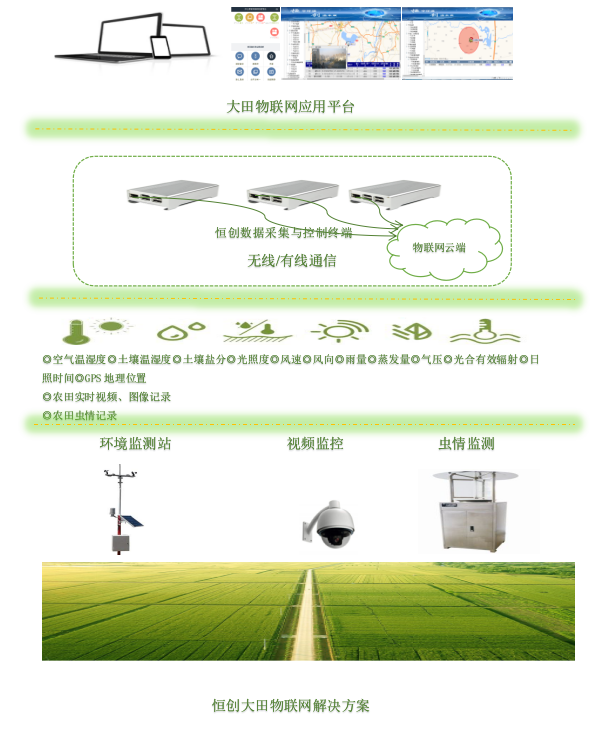 对农作物苗情、墒情、病虫情、灾情实时监测,通过农业传感器、视频图像、虫情测报灯等进行自动化监测,实现农情预警、农情远程专家诊断等功能。